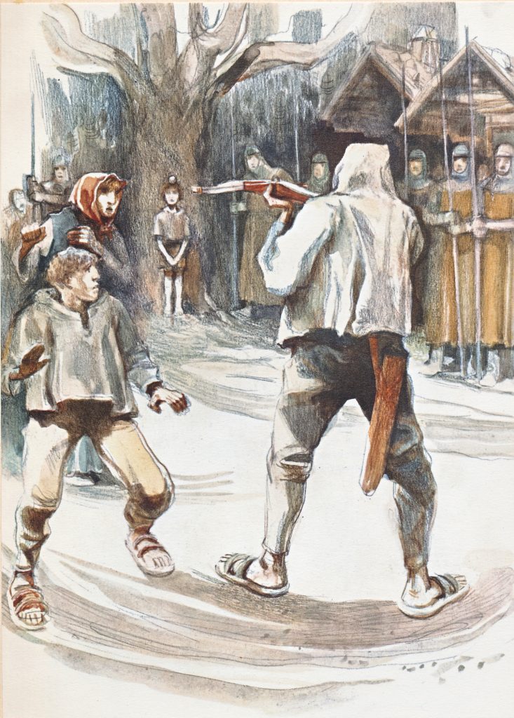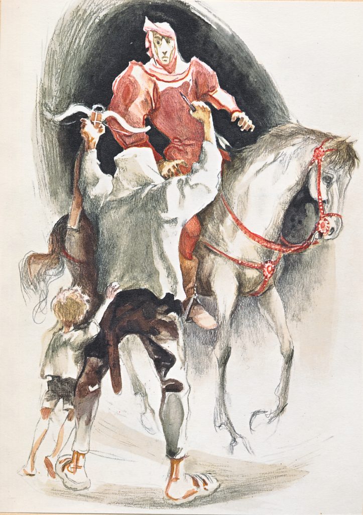 Le immagini sono tratte dal volume Guglielmo Tell, di Friedrich Schiller (1759-185), con tavole di Otto Baumberger, 1955: Zurigo, Edizioni Silva. Il dramma schilleriano in cinque atti fu rappresentato per la prima volta a Weimar il 17 marzo 1804.