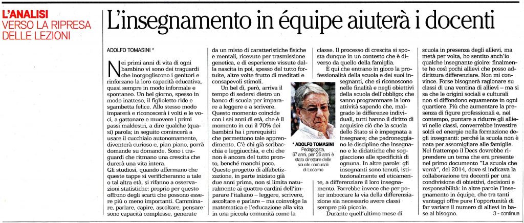 Durante quell’ultimo mese di scuola in presenza degli allievi, ma metà per volta, ho sentito anch’io qualche insegnante gioire: finalmente ho così pochi allievi che posso addirittura differenziare. Non mi convince. Forse bisognerà ragionare su classi di una ventina di allievi – ma si sa che le origini sociali e culturali non si diffondono equamente in ogni quartiere. Più che aumentare la presenza di figure professionali e, nel contempo, puntare a ridurre gli allievi nelle classi, converrebbe investire soldi ed energie nella formazione degli insegnanti: perché la scuola non è nata per assomigliare alle famiglie. Nel frattempo il Decs dovrebbe riprendere un tema che era presente nel primo documento «La scuola che verrà», del 2014, dove si indicava la collaborazione tra docenti per una condivisione di obiettivi, decisioni e responsabilità: in altre parole l’insegnamento in équipe, che tra tanti vantaggi offre pure l’opportunità di far variare il numero di allievi in base al bisogno.